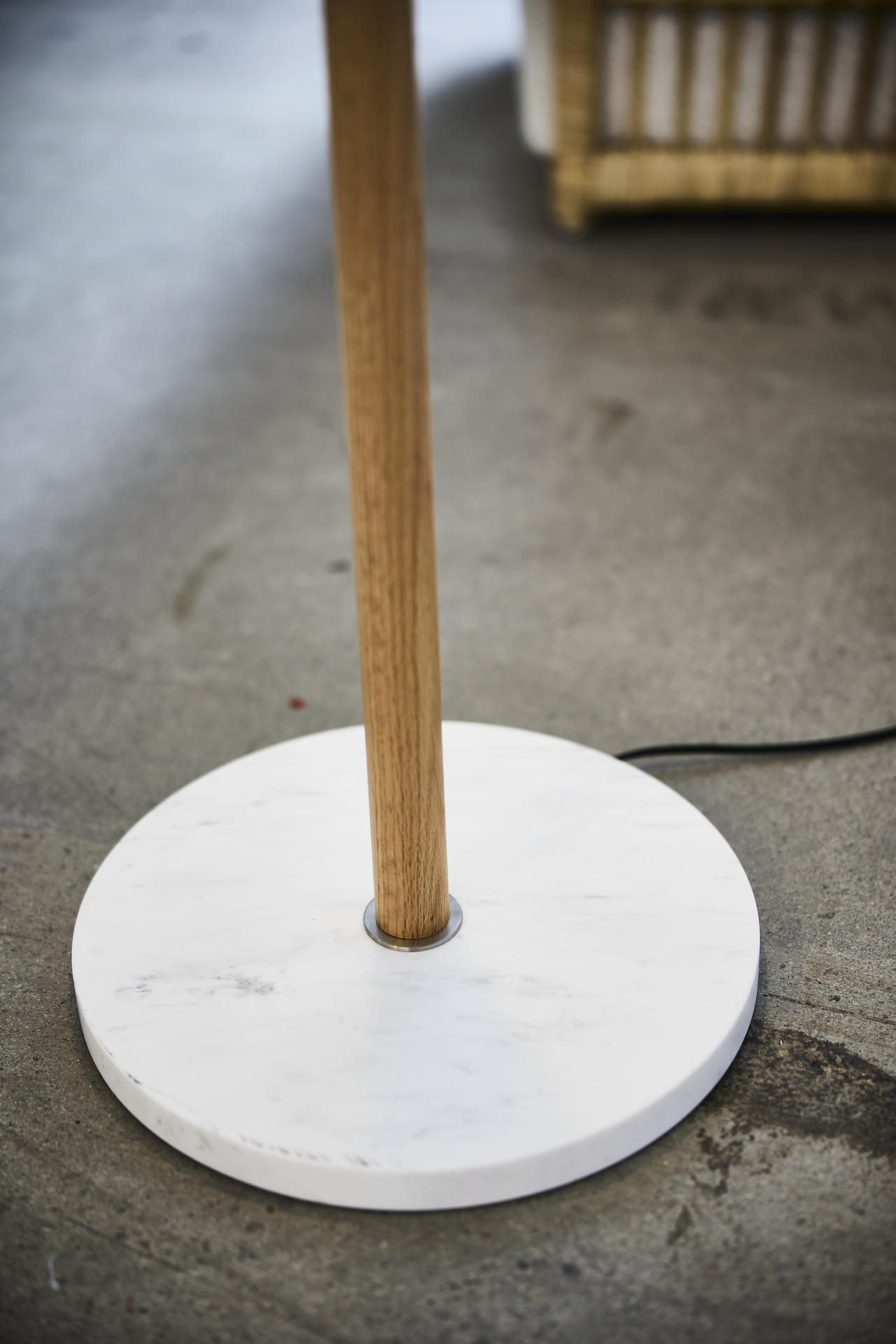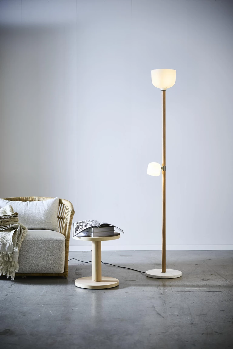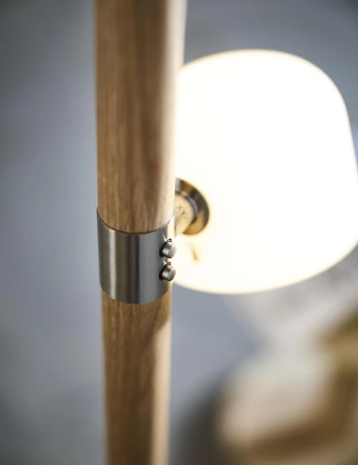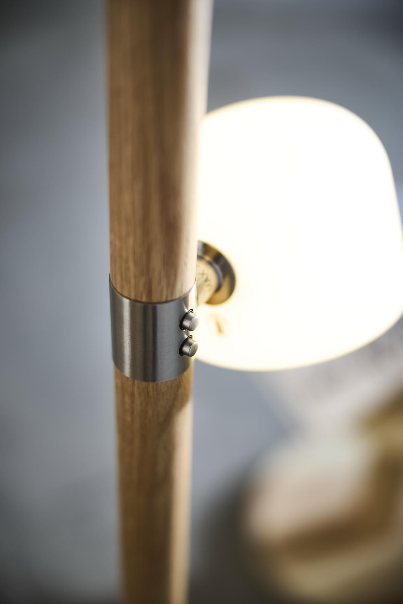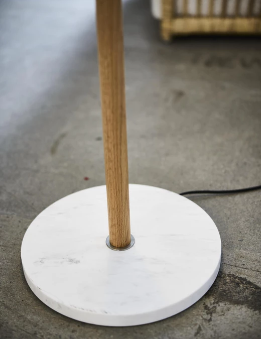 MOSSPLYM wykonano z litego dębu, dmuchanego szkła oraz białego włoskiego marmuru Carrara. Dostępna w wersji z jasnego lub ciemnego drewna, smukła konstrukcja opiera się na marmurowej podstawie, której naturalne użylenie sprawia, że każda lampa jest unikatowa.