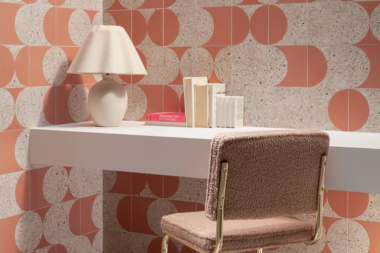 Chcąc uchwycić klimat lat 70. i 80., Maciej Zień postawił na żywą kolorystykę oraz kultowy wzór lastryko. Popularne terazzo pojawia się w propozycji Funky we współczesnej, wielobarwnej odsłonie, wypełniając wnętrze radosnymi barwami, odważną formą i mieniącymi się drobinkami, które przypominają widowiskowo rozrzucone w powietrzu konfetti. Bazę kolekcji stanowią płytki ścienne w podstawowym formacie 33 x 90 cm, dostępne w czterech wersjach kolorystycznych: Funky White, Pink, Blue i Green. Ich odpowiednikami są uniwersalne płytki gresowe w kształcie kwadratu (598 x 598 mm). Wszystkie płytki z kolekcji Funky mają wykończenie matowe.