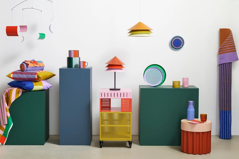 Kolekcja Tesammans jest bardzo graficzna i różnorodna. Znajdziemy w niej tekstylia, zegar ścienny, lampy wiszące i stołowe, serie szklanych naczyń, mobil, stołki czy wózek na kółkach.