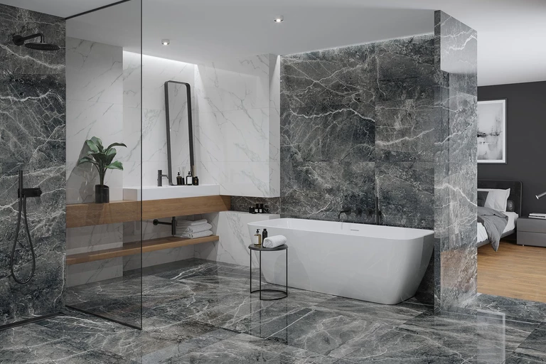 Kolekcja Marble Skin stanowi powiew niewymuszonej elegancji w najlepszym wydaniu. Inspirowana ponadczasowym marmurem, prezentuje jego szlachetne i klasyczne oblicze. Kolorystyka płytek utrzymana jest w odcieniach głębokiej szarości w surowym, matowym wykończeniu. Całość została podkreślona brązowymi i czarnymi żyłami wykończonymi błyszczącym tuszem, co tworzy wysublimowany efekt. To kolekcja, która będzie stanowić doskonałą bazę aranżacji w różnych stylach.