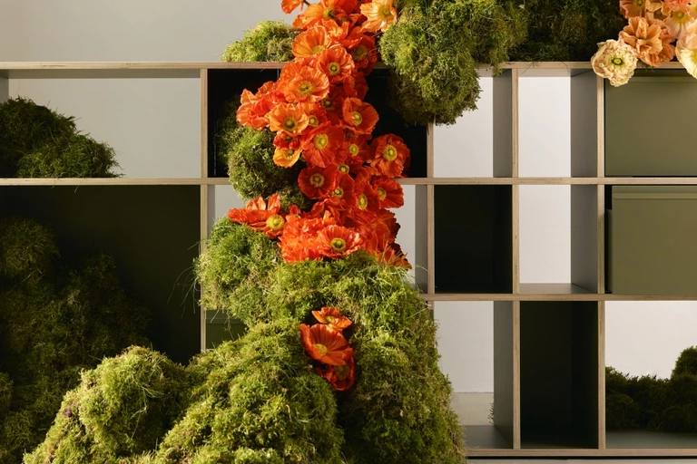 W ramach premiery nowego odcienia marka Tylko zaprosiła berlińską florystkę Carolin Ruggaber do stworzenia instalacji, w której mebel stał się płótnem dla żywej, roślinnej rzeźby. Kaskady mchu i wiosennych kwiatów otuliły regał w odcieniu Moss Green, podkreślając organiczny charakter koloru.