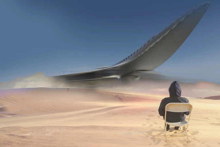 This visionary design of the hotel impresses not only with its well-thought-out architectural shape, but also with an approach that focuses on ecology. The object located in the desert would use, among other things, the wind to create the energy it needs.