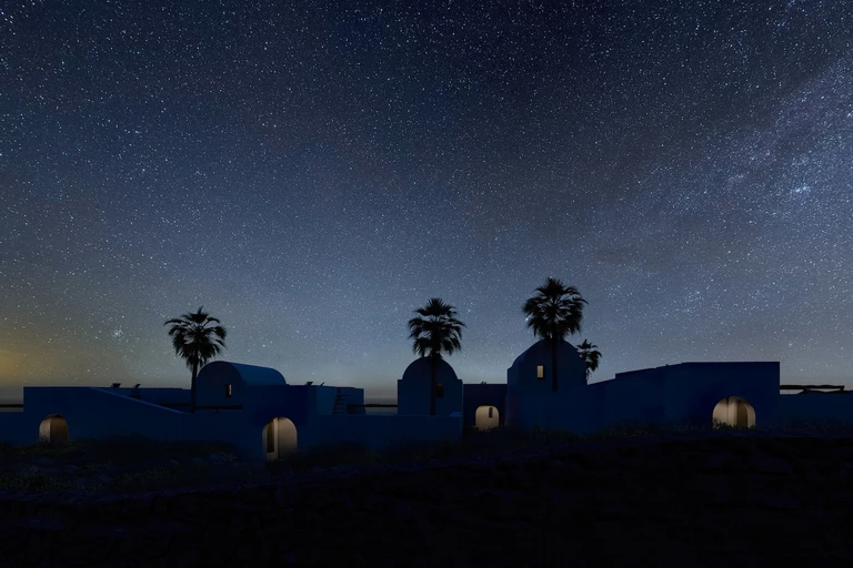 The entire complex refers to the traditional architecture of the island. It is composed of 8 monolithic rectangular shapes with arched ceilings, private courtyards, swimming pools and semi-open spaces. Each house consists of a living room with a kitchen, two bedrooms and a bathroom.