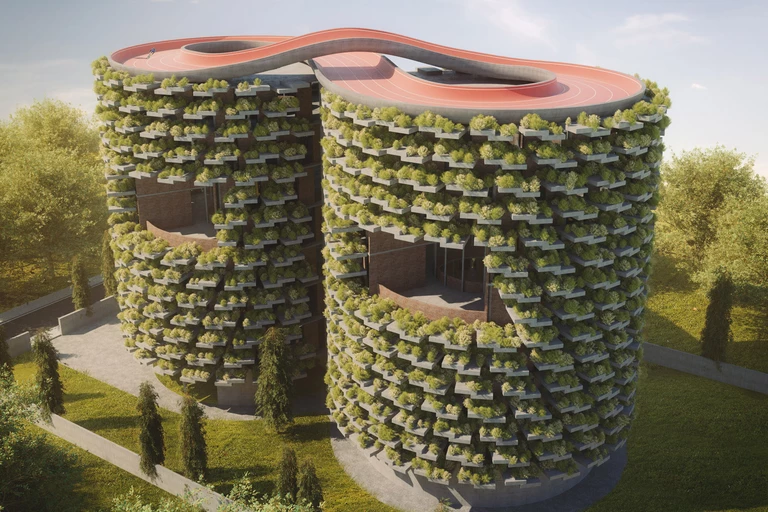 This project is the reason why we could go back to school. The 32-meter-high building on the roof has a bicycle track, and the facade is surrounded by stepped balconies covered with greenery.