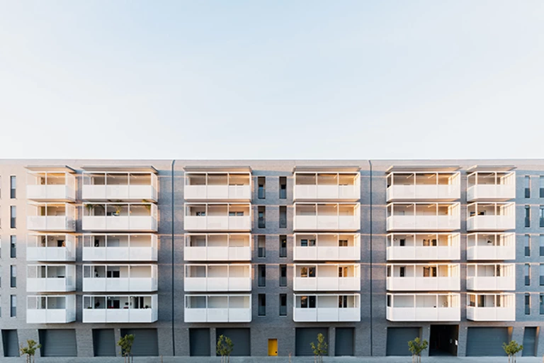 The architects decided on a simple body covered with gray brick. The uniform facade is broken by perforated metal balconies. The result is a rigorous and simple design that contrasts with the chaotic architecture of the surroundings.
