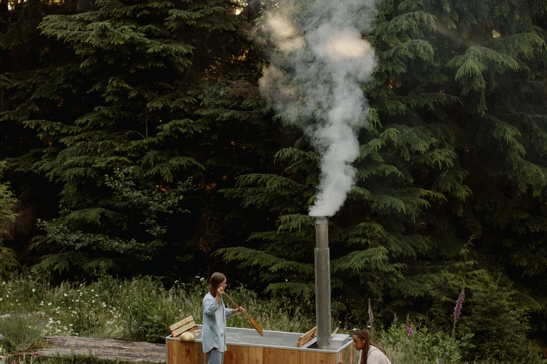 A wood-fired bathtub celebrates the entire experience - from picking up fallen branches, cutting wood, heating water - and finally relaxing among the trees.