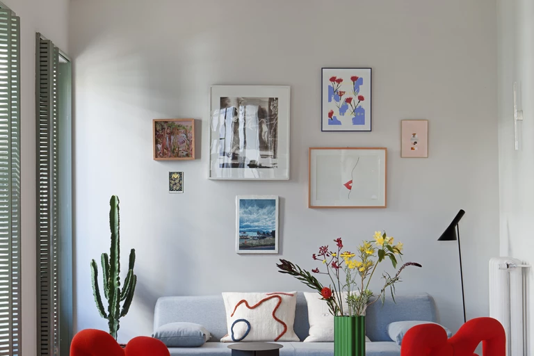 The floor is made of green terazzo tiles that blend well with the burgundy buildings. The kitchen is connected to the living space with a wide opening through which natural light enters. The large table is the perfect place to celebrate joint meals.