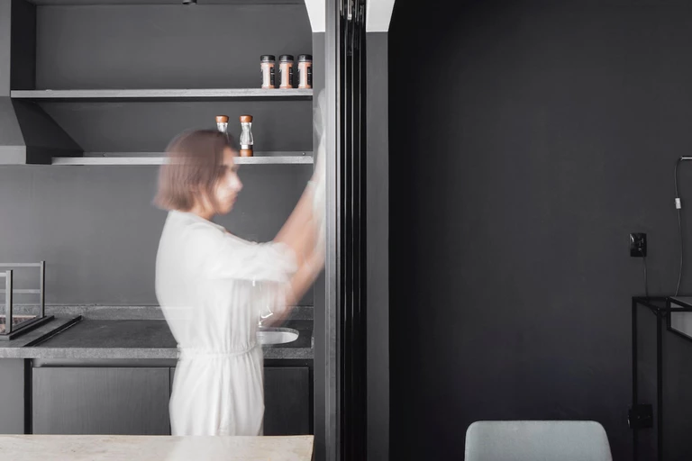 The first space we see after entering the apartment is a completely black hall. Black also penetrated the kitchen, which was divided in the middle into two color zones: white and black. The dividing line passes exactly through the middle of the kitchen island, which creates a very interesting effect. The living room focuses on simplicity in a modern version. As the designers themselves say, they do not follow specific trends, but create interiors that respond to the needs of customers. Each time they use their unique style. As for the color palette, the interior is quite monochrome, based on the contrast between white and black, between them also appears the entire spectrum of shades of gray. To make the apartment more cozy, it was decided to use built-in wardrobes from the local Pau Ferro wood species. The apartment has two comfortable bedrooms with private bathrooms. In one, apart from the bed, there is a place to work, and in the other a spacious wardrobe with a comfortable window seat.