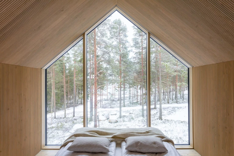 This area of ​​Finland has historically been a Sami settlement. Hence the idea for inspiration with Lapland architecture. Thanks to the huge glazing, the interior of the hut blends seamlessly with the surrounding nature.