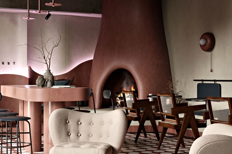 The owners wanted to combine modern architecture with vintage accents, such as the original chairs by Pierre Jeanneret, who were saved from a previous restaurant. The concrete arches were left in their original condition and the floor tiles were recycled. Decorative plaster appeared on the walls and sofa was upholstered with leather in clay color. The original interior decoration is the KAWS "Small Lie" sculpture. Alexander Calder's sculpture was the inspiration for the modular sofa design.