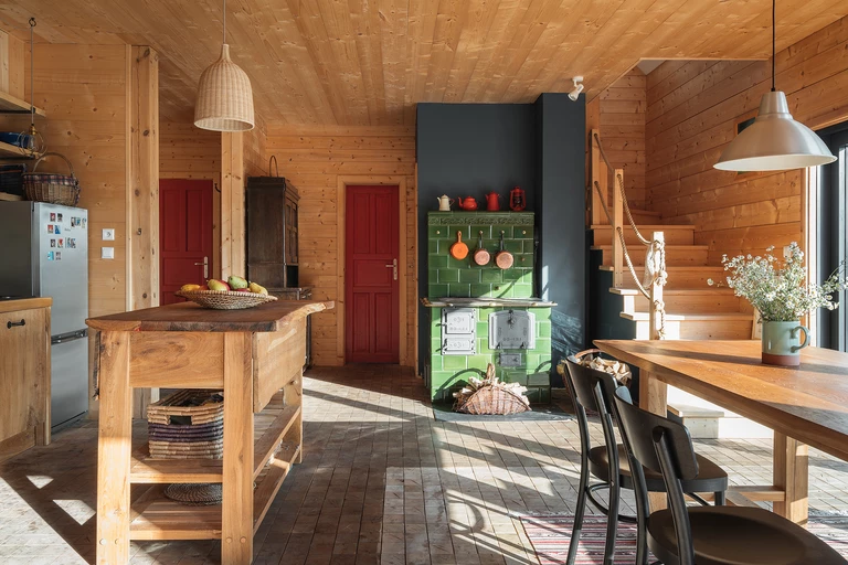 The project keeps a simple material pallet, using a black standing seam metal roof and uniform warm wooden paneling on both the exterior and interior. Except for the bathroom tiling, the entirety of the interior is composed of wood, including a handcrafted dining table, kitchen cabins and island, and bathroom sinks. Adding to the warm, homey feel of the place, the project features both a wood heating stove and custom tiled cooking stove.
