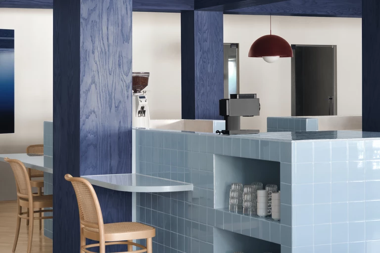 In contrast to the light wood floors and the walls painted white, the columns are covered in cobalt. The characteristic color additionally strengthened the brand identity, it is also visible on tables or curtains. Decorative mirrors are covered with fading foil, which gives depth and mystery to the entire space.