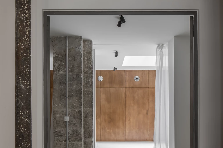 Minimalist spotlights emphasize the industrial character of the interior. In the corridor there are simple cast concrete benches, accompanied by wooden headboards. Buildings made of wood warm up the quite austere interior.