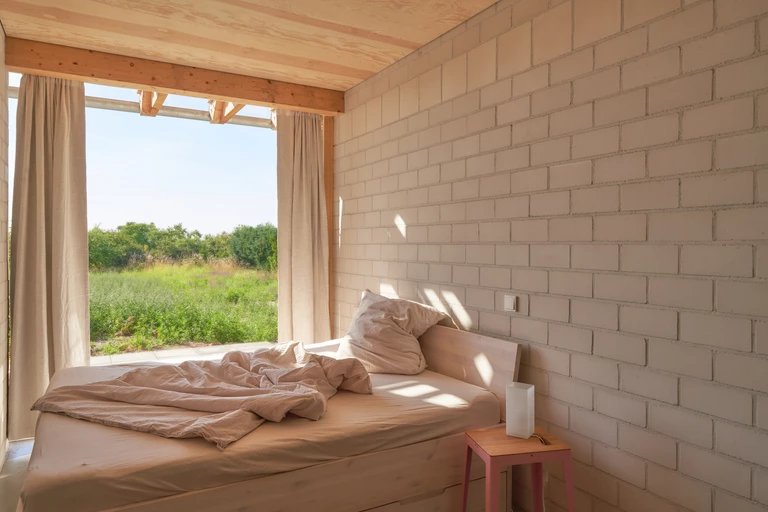 All rooms open onto a large covered terrace to the west. The beds are positioned along the façade, so they can be entered both from the inside and directly from the terrace.