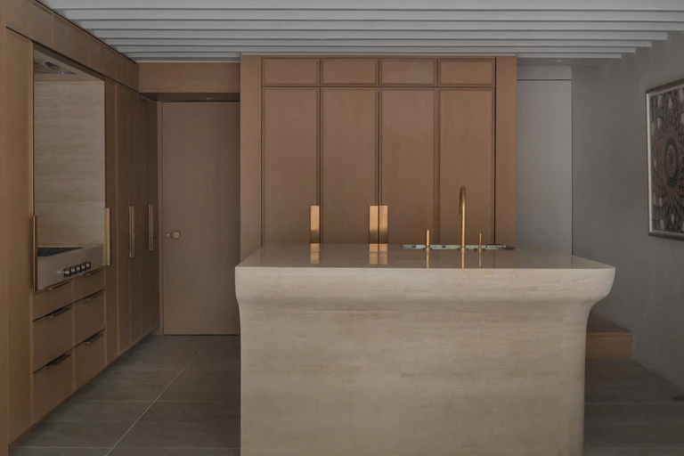 The floors in almost the entire house are white oak, only in the bathrooms and the kitchen, it was decided on mottled French limestone. On the walls there is a rich lime plaster applied directly to the brick, which ensures the diffusion of moisture. The monolithic stone kitchen island on the ground floor and the faceted fireplace on the first floor are carved from single blocks of travertine.
