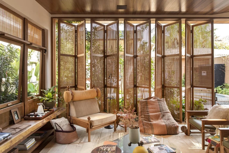 The great advantage of the apartment is a garden filled with plants, surrounding the loft. To seamlessly blend it with the interior, a decision was made to use French folding doors made of local Coumar wood. Light and air are filtered through the gaps in the screens, thus regulating the temperature and sunlight.