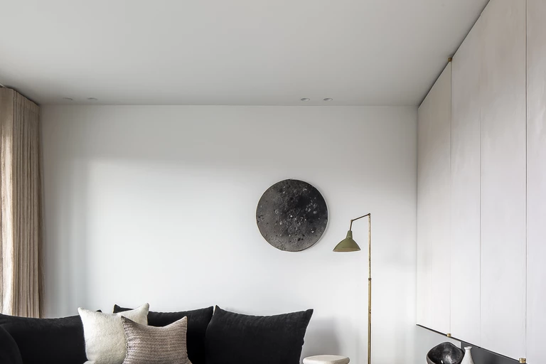 The architects opted for a subdued color palette, based on shades of beige, brown and white. The kitchen furniture was hidden in a marble cube, its elegant shape resembles a minimalist sculpture.