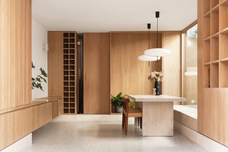 The architects preserved only the skeleton of the building. A Japanese tree decorates the courtyard, which is surrounded by 3.7 m long glass, creating a dominant focal point in the space. A large revolving window and glazed door connect the front of the house to the back. The rear of the building has been extended to accommodate a large kitchen and dining room.