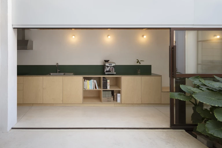When they're open, the line between the kitchen and the patio blurs, making it impossible to tell where one ends and the other begins. The concrete pavement extends from the inside out, thus emphasizing the sense of continuity.