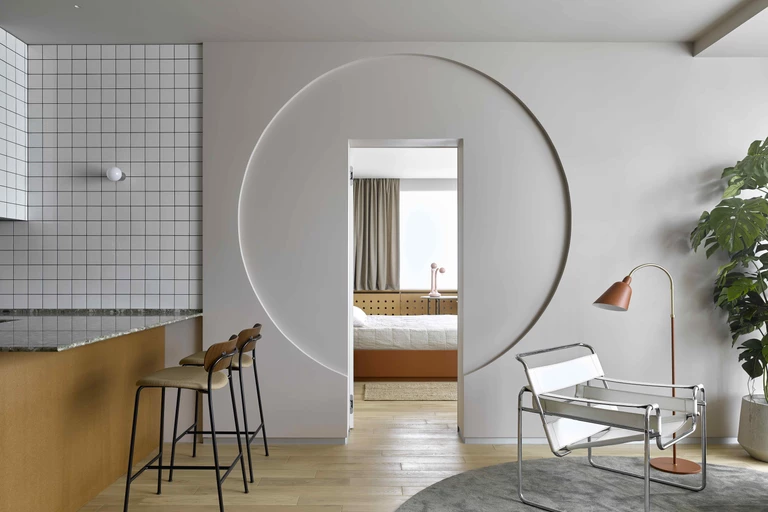Design classics such as the famous Wassily armchair designed by Marcel Breuer were used in the living room. The interior also features some contemporary furniture: from the Menu sofa designed by Norm Architects, to the "Pavilion" stools by Anderssen & Voll for & Tradition, the Mezcla table by Jaime Hayon for & Tradition, to the classic pink "Roly Poly" armchair by Faye Toogood for Driade in the bedroom.