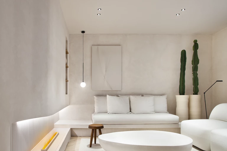 Only natural and sustainable materials were used: wood, natural fabrics, stone and plaster. Instead of a free-standing sofa, a seat was chosen that wraps almost around the entire room. It flows smoothly into a minimalist design. The grooving adds an elegant character to the space.