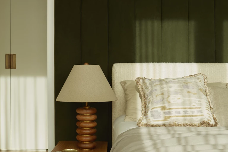The palette of materials from the bathrooms corresponds with the elements in the master bedroom area, where brass and stone contrast with the soft and rounded lines of the upholstered furniture. The wall panels behind the bed, upholstered in soft Alcantara fabric, create a strong accent in the space and contrast with the monochrome, bright color palette.