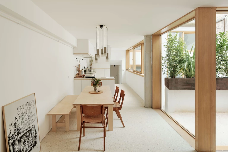 The interior is simple. Oak, corten steel, birch plywood, concrete and terrazzo were used. In some cases, these surfaces have a continuity between the interior and exterior spaces to eliminate their boundaries between the apartment and the garden. The whole thing is very consistent and creates a great place to live in the center of bustling Paris!