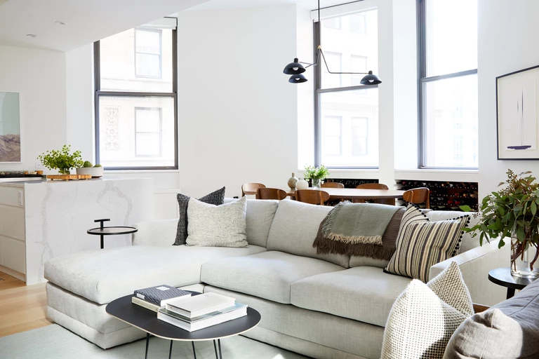 The interior is kept in a subdued color palette: white and beige dominate, complemented by black and wood. Through the large windows you can admire the buzz of New York's financial district.