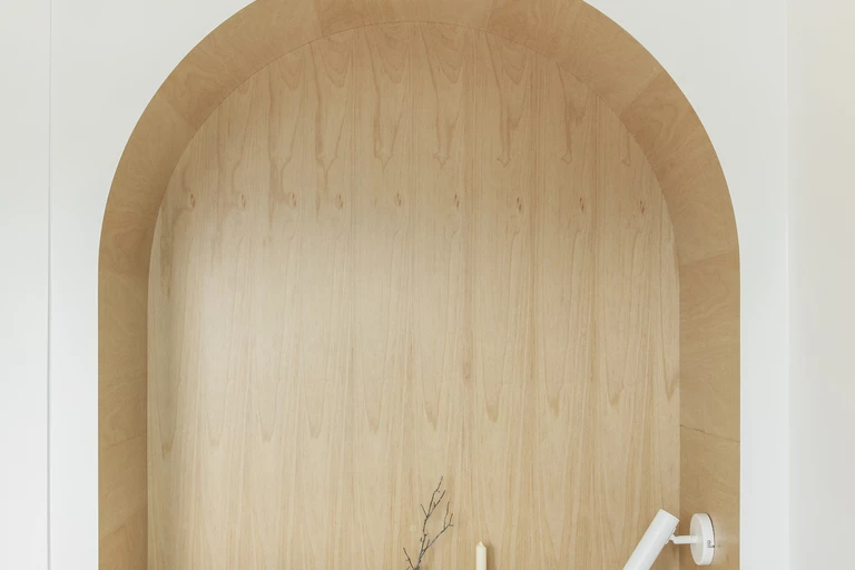 The bed was placed in a built-in wardrobe, and the shelf behind it was used as bedside tables. A decorative arch-shaped niche lined with wood adds a homely character. Under the window there are low cabinets that also serve as a seat.