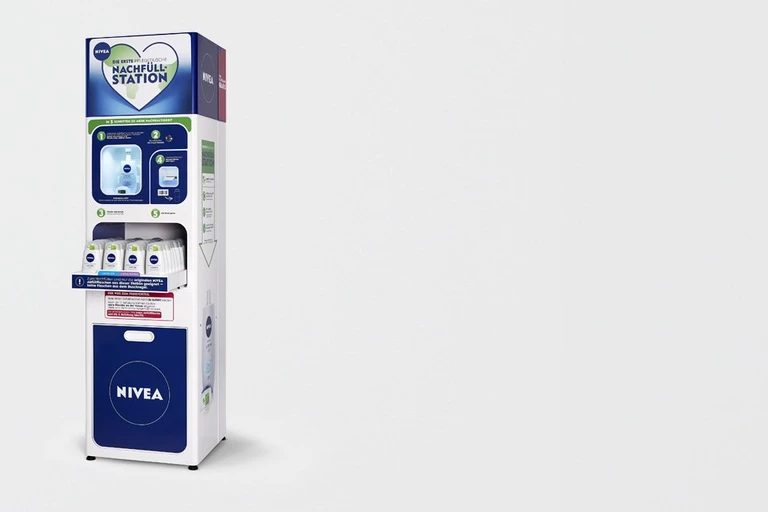NIVEA is one of the largest brands belonging to the concern. The shampoos, soaps and lotions they sell are packed in plastic packages. The company decided to test a machine for refilling reusable packaging in two German cities.