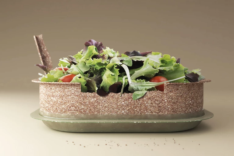 The lid of the container is made of polyhydroxyalkanoate (PHA), a bacterial-based composite with properties similar to plastic and is not edible, but can also be composted in ordinary compost bins where it decomposes in less than six weeks.