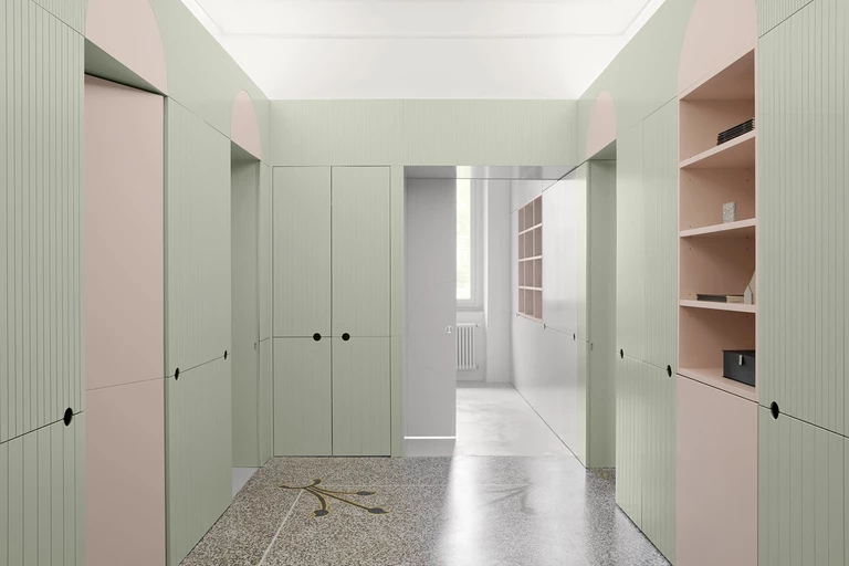 The interior is dominated by pastel colors: pink and pistachio blue. In the hall, it is worth paying attention to the unique floor: terrazzo with a floral motif.