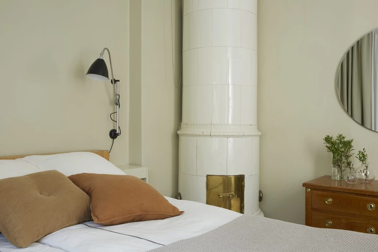 In the bedroom, it is worth paying attention to the original, antique stove, which is certainly an unusual decoration of the interior.