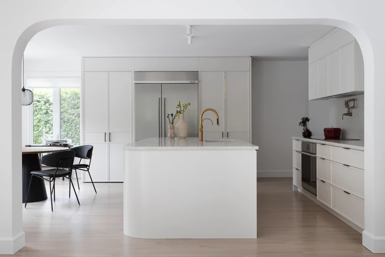 The stairs set the main theme for the whole house. The repetition of smooth, curved lines and the use of white combined with black and brass details appear in almost every room. The original windows have been widened and wide patio doors have been added to the ground floor, allowing plenty of natural light to fill the interior.