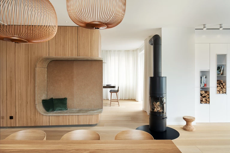 The interior is dominated by white walls, Scandinavian lightly oiled oak on slats, matching shades of beige and brown and colorful accents in recesses. A fireplace that can be seen from several sides completes the interior.