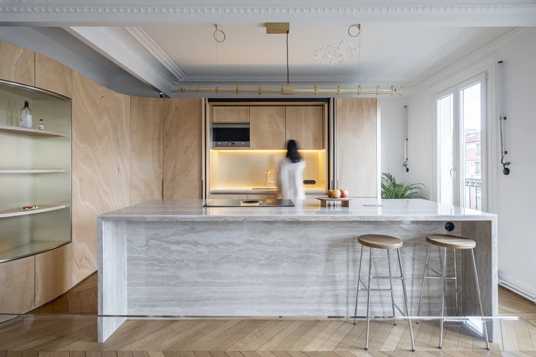 Old Parisian tenements are almost a guarantee of a beautiful interior. Antique stucco, beautifully decorated rosettes, original window joinery, double doors - you don't need much to make such an interior look spectacular. Designers from the Toledano + Architects studio decided to approach the topic in a completely different way and placed almost in the center of the historic apartment a plywood wall.