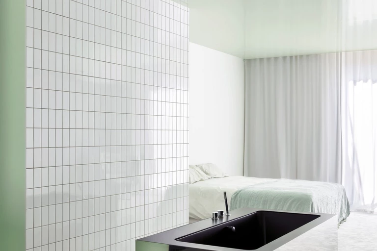 The ceiling was painted with mirror paint, which gave the space a surreal character. In the very center was a bathtub covered with a mirror steel sheet that reflects the surroundings.