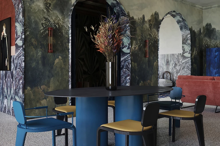 In the dining room, the wallpaper has become the protagonist: the fresco gives the illusion of being in the midst of nature. The whole was completed with marble accents and terrazzo on the floor.