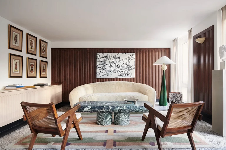 This project also included typical Milanese accents, such as a cast terrazzo floor or hand-made handles made of Murano glass. The elegant walnut paneling on the walls contrasts with the travertine.