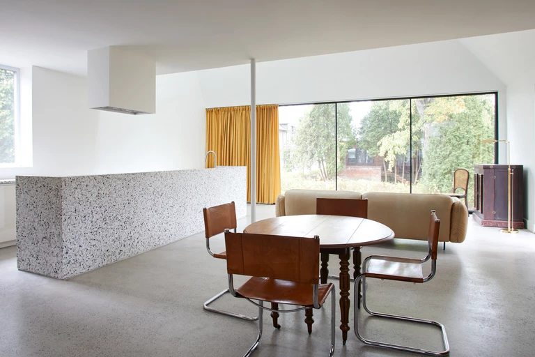 The functional layout of the interior was also changed; the living area was situated from the garden, thanks to which you could allow yourself more freedom in the interior. In the kitchen, in the very center, there is a terrazzo island, and the main decoration of the living room is a view of the garden.