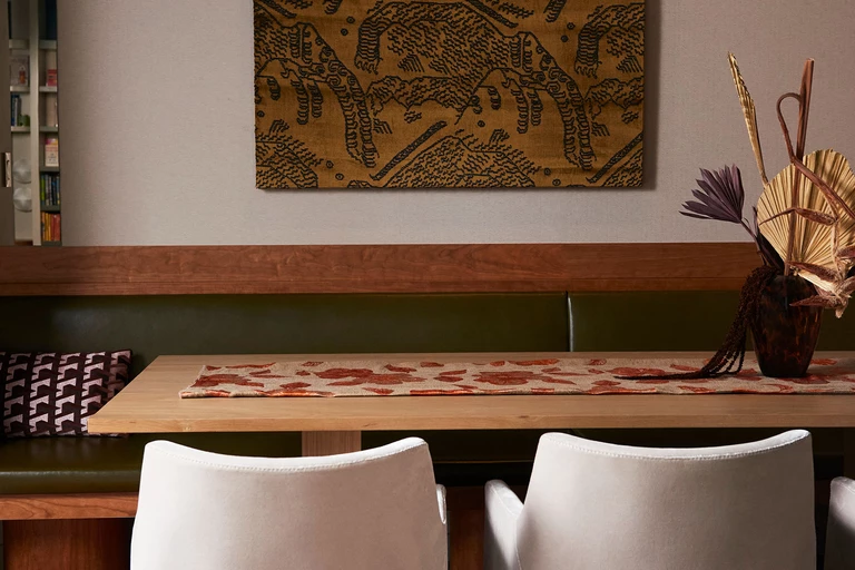 In the dining room we are delighted with a bench made of wood, decorated with olive leather cushions. The whole is finished with a picture made of Dedar fabric. A fascinating mix!