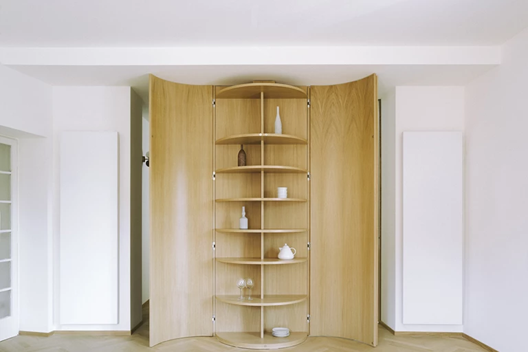 The narrow, labyrinthine corridor that characterized the initial layout of the apartment has become a comfortable space thanks to the opening of the rear wall, which visually connects the entering with the main part of the living room-study.