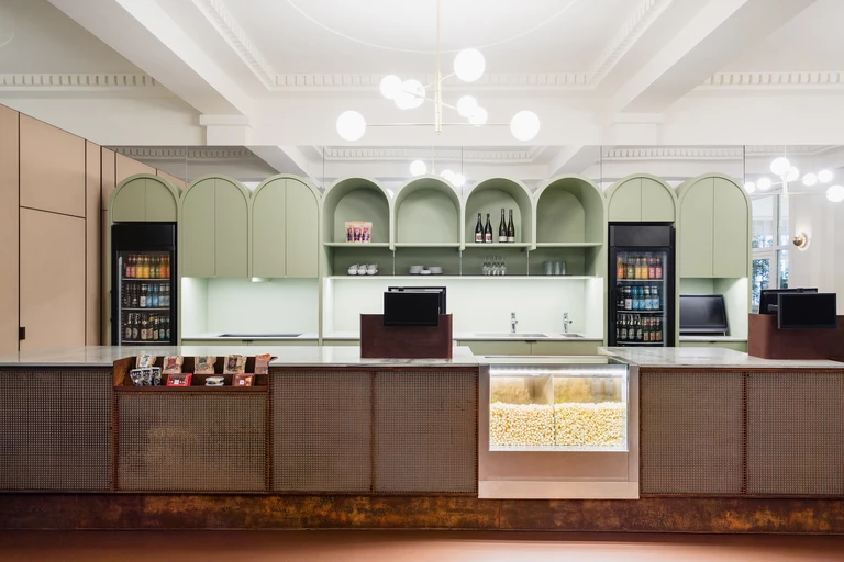 The aesthetics of the building complex is determined by the shape of large arched windows on the main façade. BATEK ARCHITEKTEN used this dominant, recurring form to design a new foyer bar. Natural shades refer to the earthy reddish-brown color of the original preserved on the linoleum in the foyer. A surprising pistachio-green color has been selected for this, which balances the entire composition.
