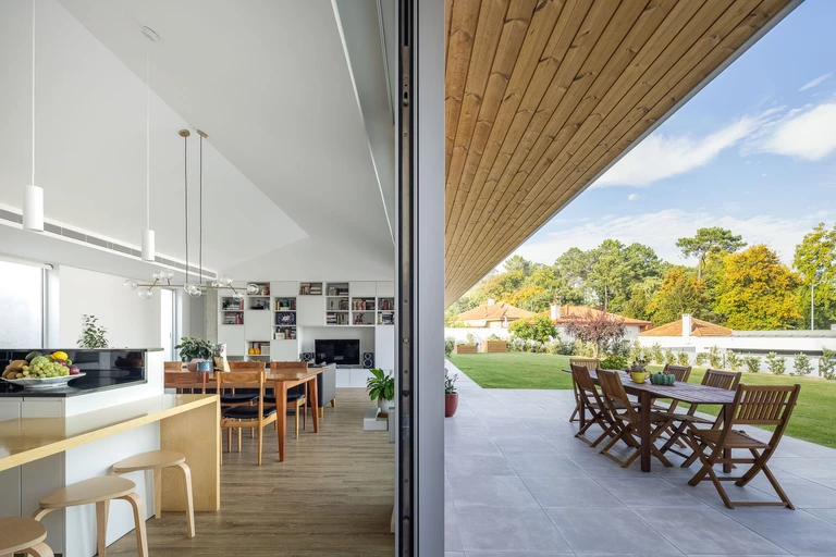 This villa is located in a residential area of ​​the city of São João da Madeira, Portugal. The climate there is very pleasant and is perfect for spending time outside. Therefore, the façade of the one-story house is largely glazed, and the sliding doors encourage to open the interior to the garden.