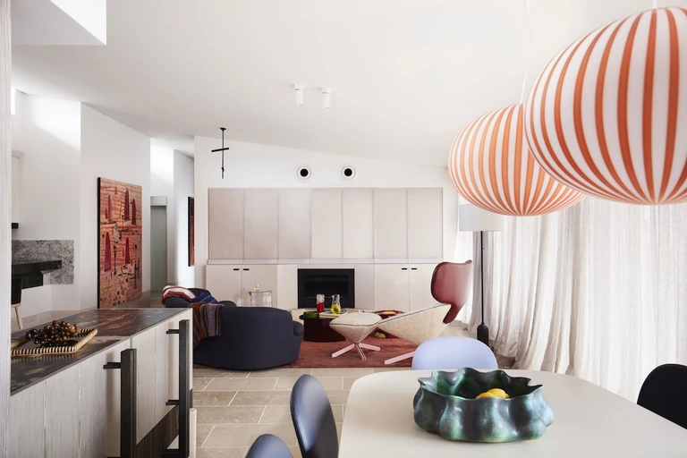 Candy Lamps - Glass 'beach balls' by Established and Sons float above the main table. In the bedroom, a shell-like Plafoniere lamp in the style of Jean Charles Moreux hovers like a cloud.