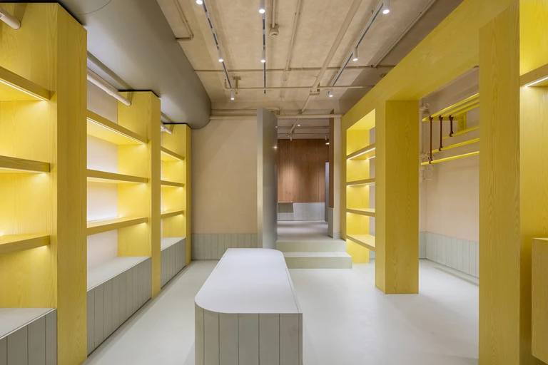 Hand-tinted yellow wood veneer has been chosen as the eye-catching material in the main room. The second room in the back has a more soothing and cozier atmosphere, the light yellow veneer has been replaced with natural paneling. A muted mint green microcement floor has been used throughout the space to ensure consistency.