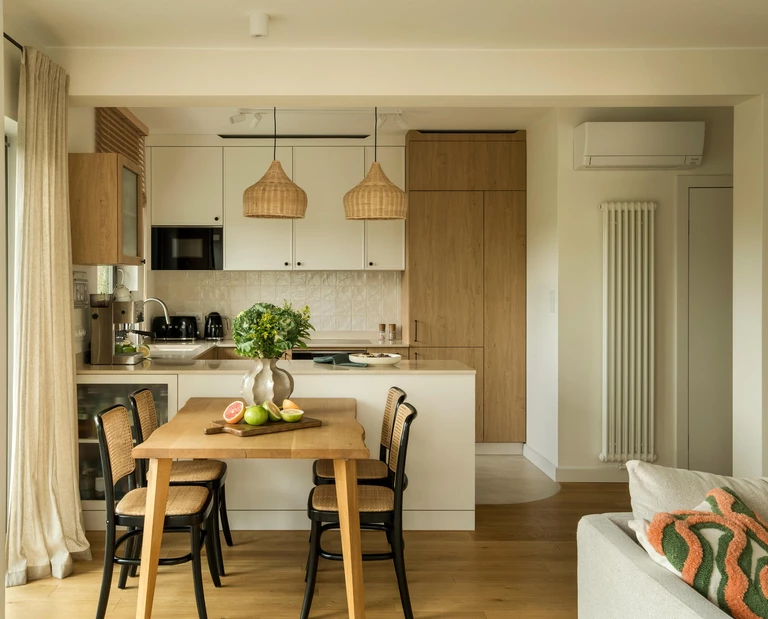 W jednym z warszawskich bloków z wielkiej płyty znajduje się mieszkanie z widokiem na piękną, bujną zieleń. To właśnie w nim projektantka z P/art stworzyła przytulne wnętrze, pełne harmonii, światła oraz naturalnych materiałów. Nie było to jednak zadanie tak proste, jak mogłoby się wydawać, bo na jej drodze stanęły takie wyzwania jak niefunkcjonalny układ czy mikroskopijna łazienka.
