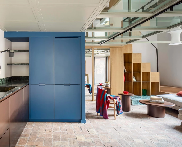 Szklana antresola i niebieski moduł w secesyjnych murach. STUDIOTAMAT w Rzymie