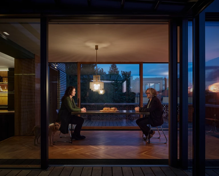 Szeregowy dom z lat siedemdziesiątych, usytuowany na stromym zboczu pośród zieleni, przeszedł całkowitą rekonstrukcję, która połączyła go z otaczającym ogrodem i panoramą miasta. Projektantka Dagmar Štěpánová z pracowni Formafatal stworzyła dla reżysera Jana Hřebejka i jego rodziny przestrzeń, która odzwierciedla ich potrzebę bliskości natury przy jednoczesnym zachowaniu miejskiego stylu życia.