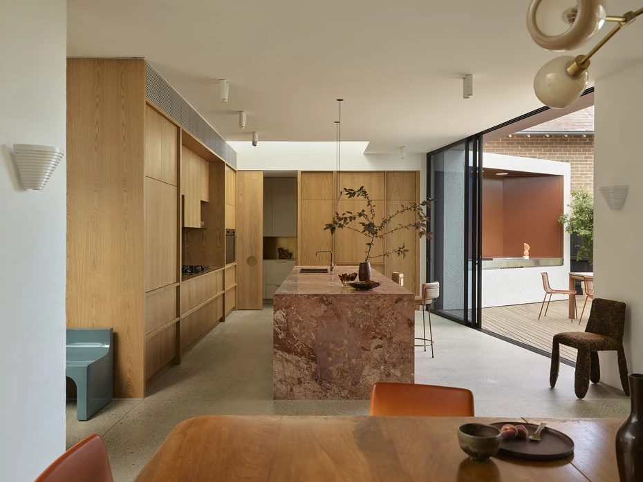 Choć dom przy Elizabeth Street w australijskiej miejscowości Geelong niedaleko Melbourne ma zaledwie nieco ponad dekadę, właściciele uznali, że kuchnia wymaga odświeżenia i wyraźniejszej tożsamości. Zaprosili do współpracy projektantkę Rebeccę Jansmę, powierzając jej pełną swobodę twórczą. Celem była renowacja istniejącej przestrzeni bez zmiany skali, ale z całkowitym przepracowaniem materiałów, zabudowy i detalu.